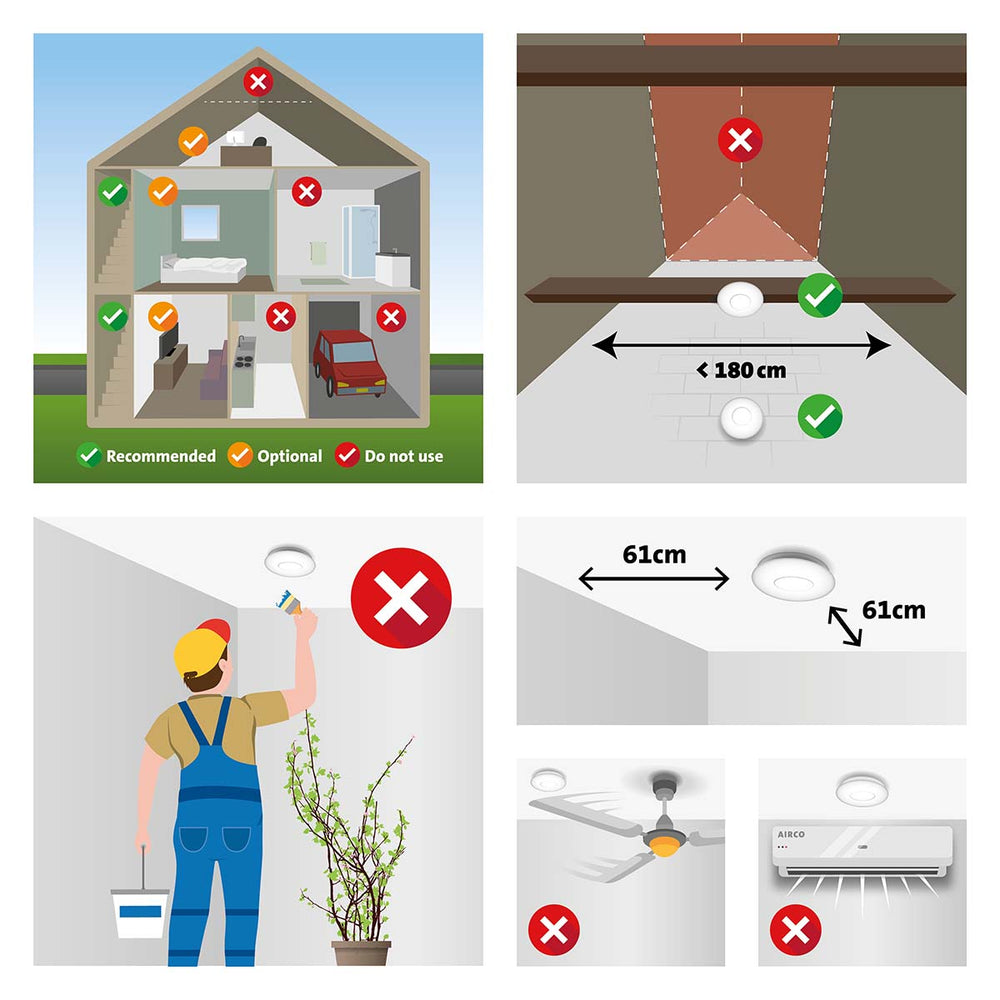 This compact smoke detector from Alecto is suitable for wall and ceiling mounting and is easy to install in the desired location. To make it even easier, it comes with a mounting base, screws and plugs. As soon as the smoke detector is clicked onto the mounting plate, the detector is activated. The best places to place smoke detectors are in the hallway or upstairs landing. These are often the escape routes if a fire breaks out in the house. If you want maximum security, install a smoke detector in every room where a fire could start. The SA300 DUO is also available per unit, SA300.