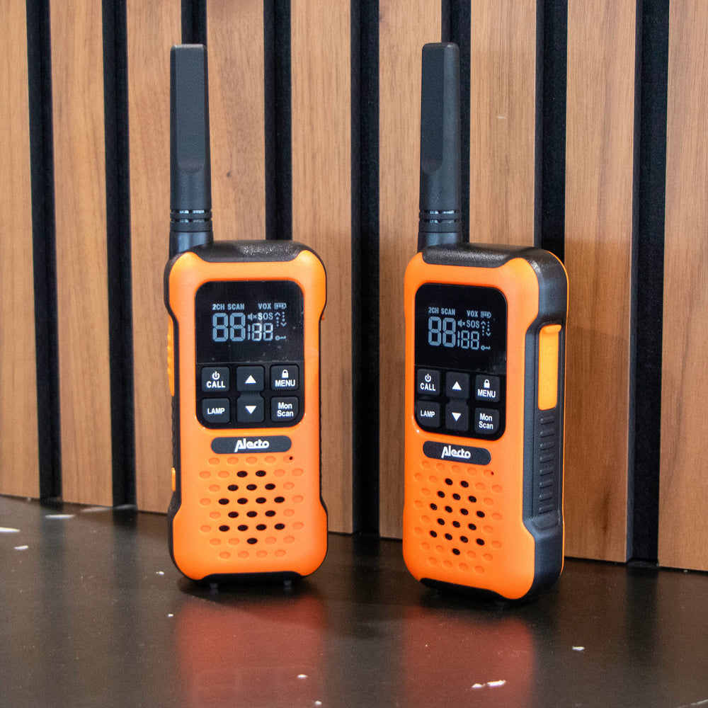 This is one of the more complete walkie-talkie sets from Alecto. Where most walkie-talkies have a range that varies between 3 and 7 kilometres, the FR300 is distinctive to others by covering a distance of up to 10 kilometres. Furthermore, the FR300 IPX7 walkie-talkie set is equipped with VOX control. No hassle with buttons: talk into the microphone and the walkie-talkie switches on automatically.