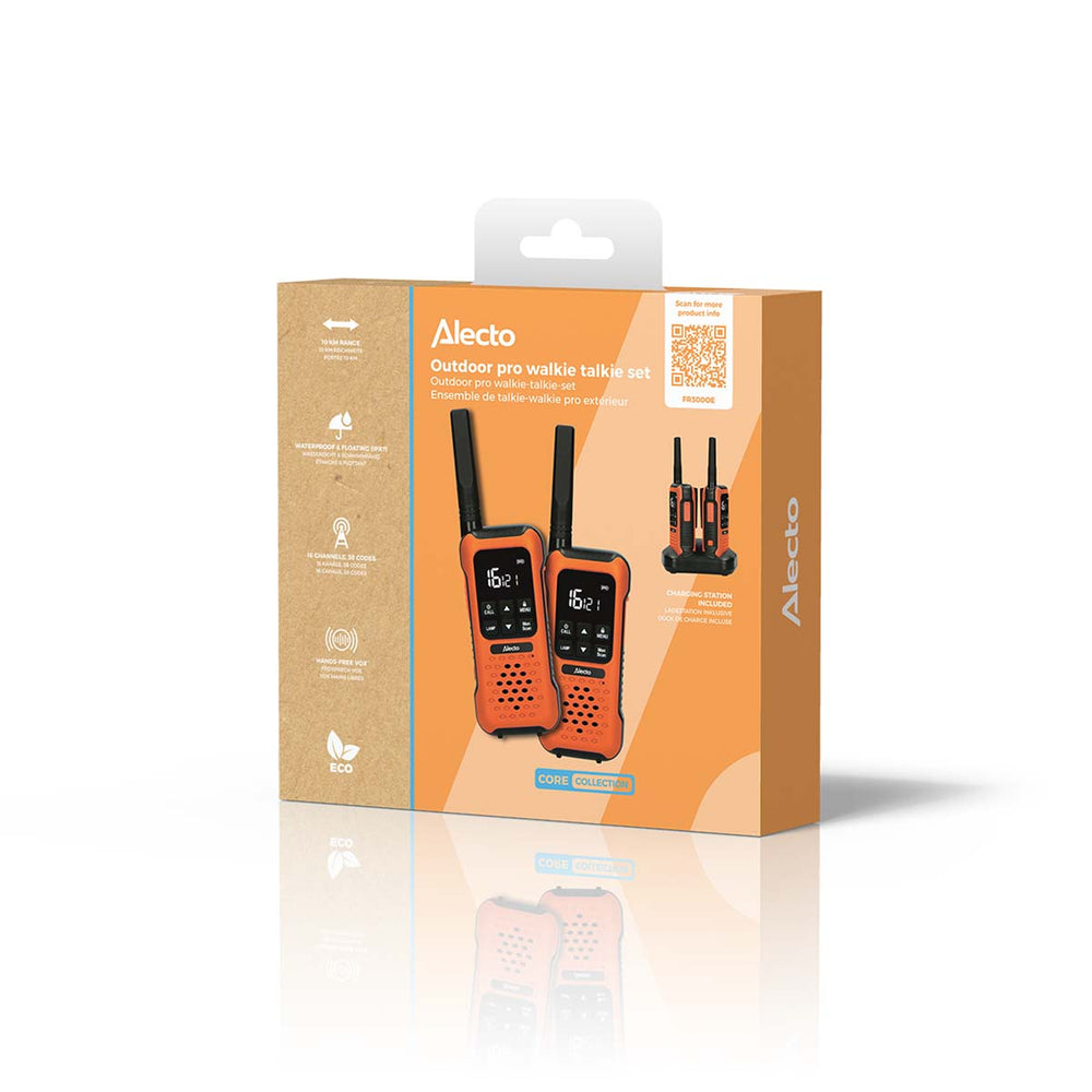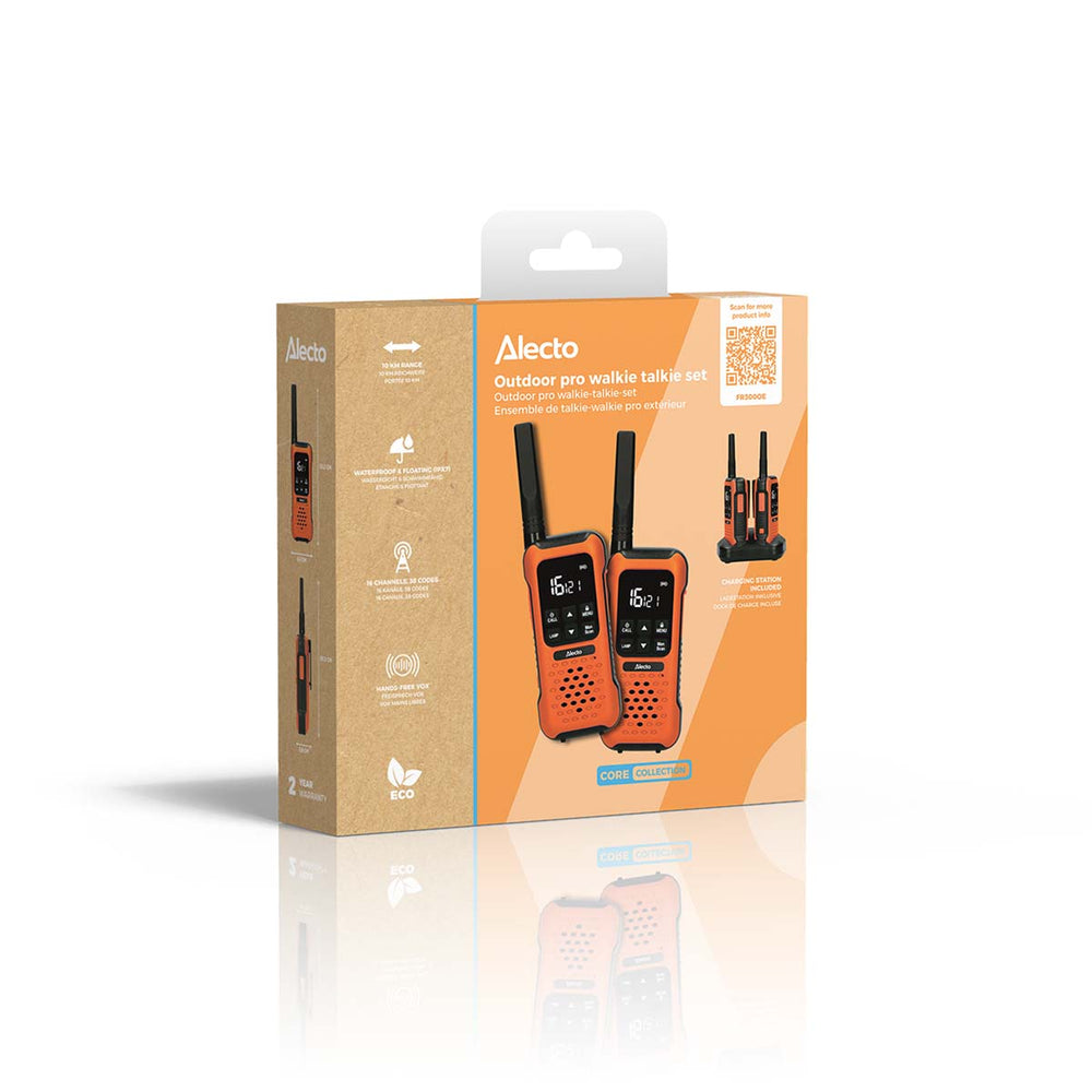 The FR300 IPX7 walkie-talkie set comes with rechargeable batteries and a charging station. With this set from Alecto you choose a high quality product for an attractive price.