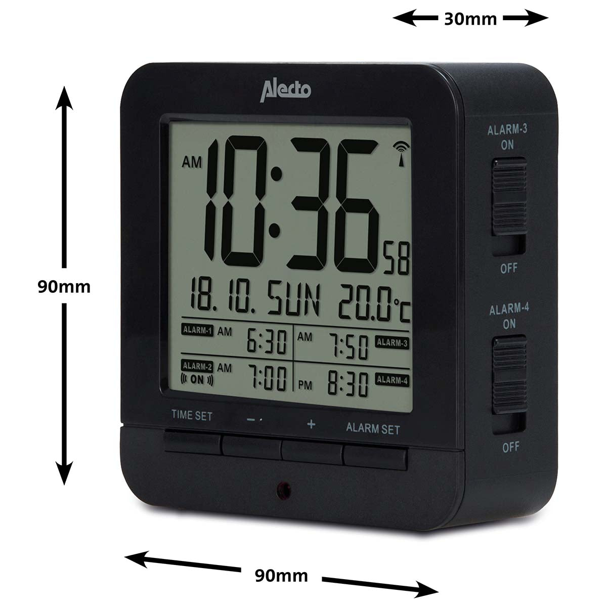 Plenty of essential information is displayed on the screen of this alarm clock. Starting with time indicated in hours, minutes and seconds; accurate to the millisecond thanks to the DCF-controlled clock. DCF clocks receive their time signal from atomic clocks and deviate from it by no more than a few milliseconds. No need to set the time yourself! Date, day and temperature are displayed below. User set wake-up times are displayed below the date and temperature. You can set a total of four alarm times on this temperature-controlled clock. Handy for you and your partner, in case of irregular working hours and weekends. Fully customize the 4 alarms to work around your daily routine.