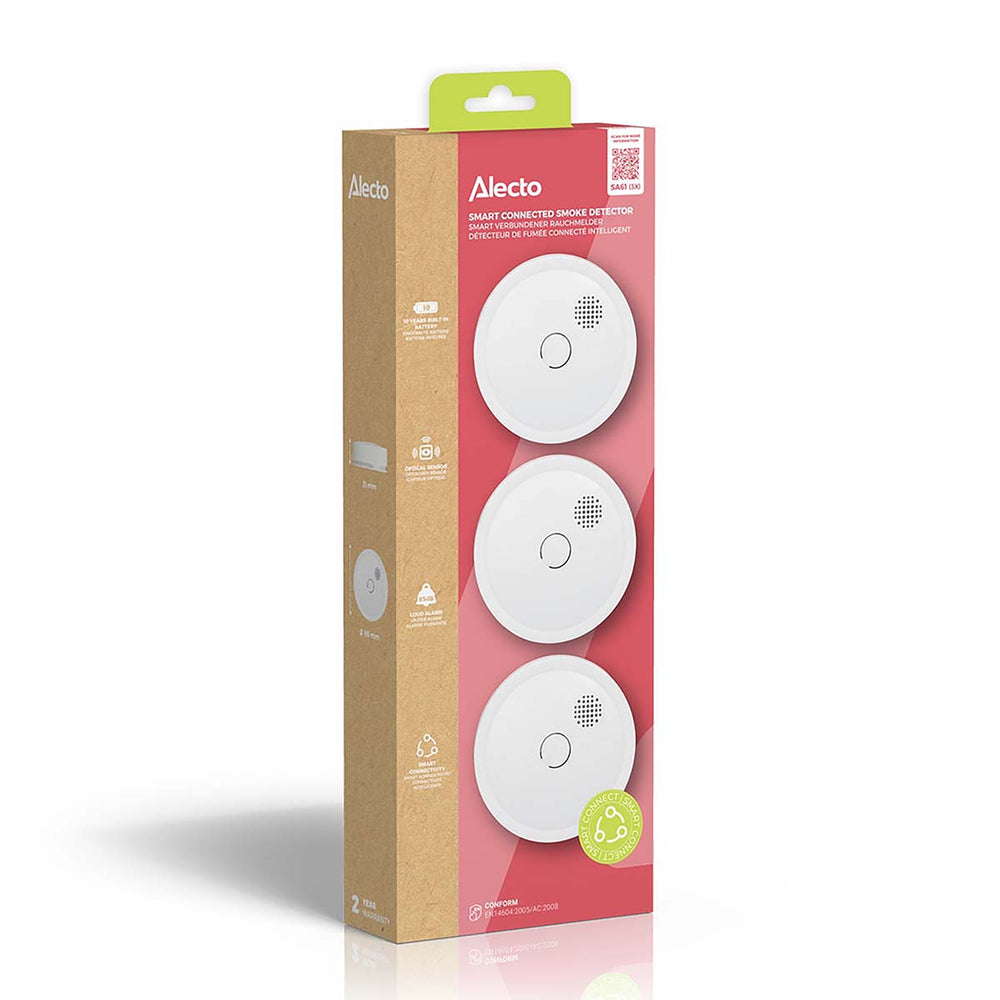 The Alecto SA61 3X is a set of three smoke detectors (model number SA61) that can be wirelessly interconnected. This provides extra fire safety. Your environment is optimally protected, because if one detector detects smoke or fire, all connected smoke detectors will sound the alarm. This wireless interconnectable smoke detector has a battery and optical sensor that both last 10 years. With the SA61 3X you are assured of a safe environment for 10 years. Of course, this smoke detector complies with the highest European tests and requirements.