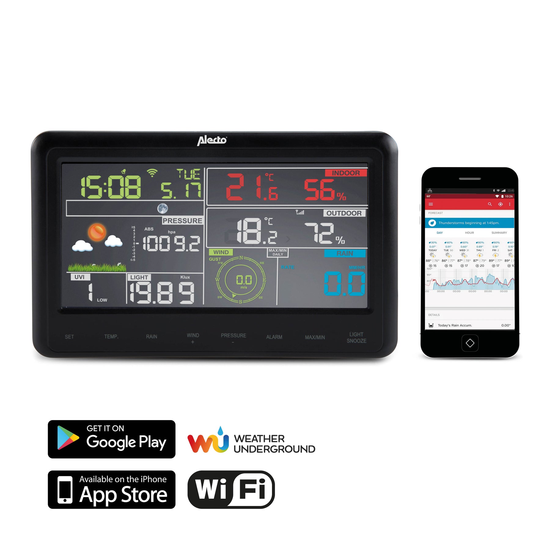 You are not dependent on the colour screen. You can access your own weather data and statistics from anywhere in the world via the WunderStation app and, just like your weather station, you can review, share and compare your data with that of other Underground Weather stations. In the app you design your own dashboards to make your weather forecast as personal and relevant as possible.