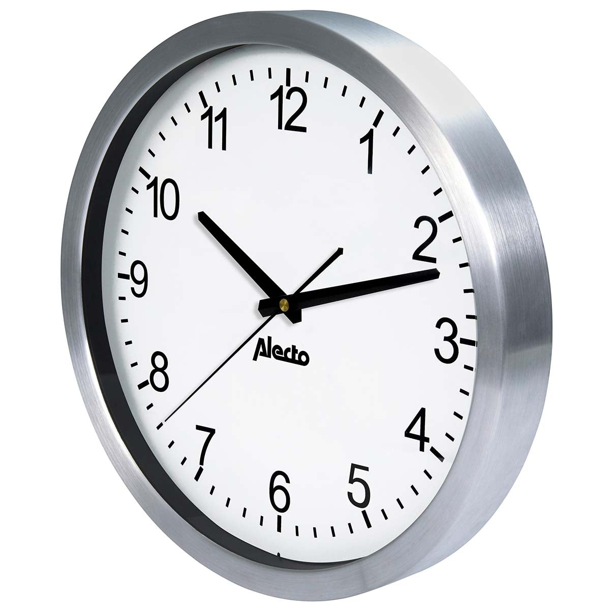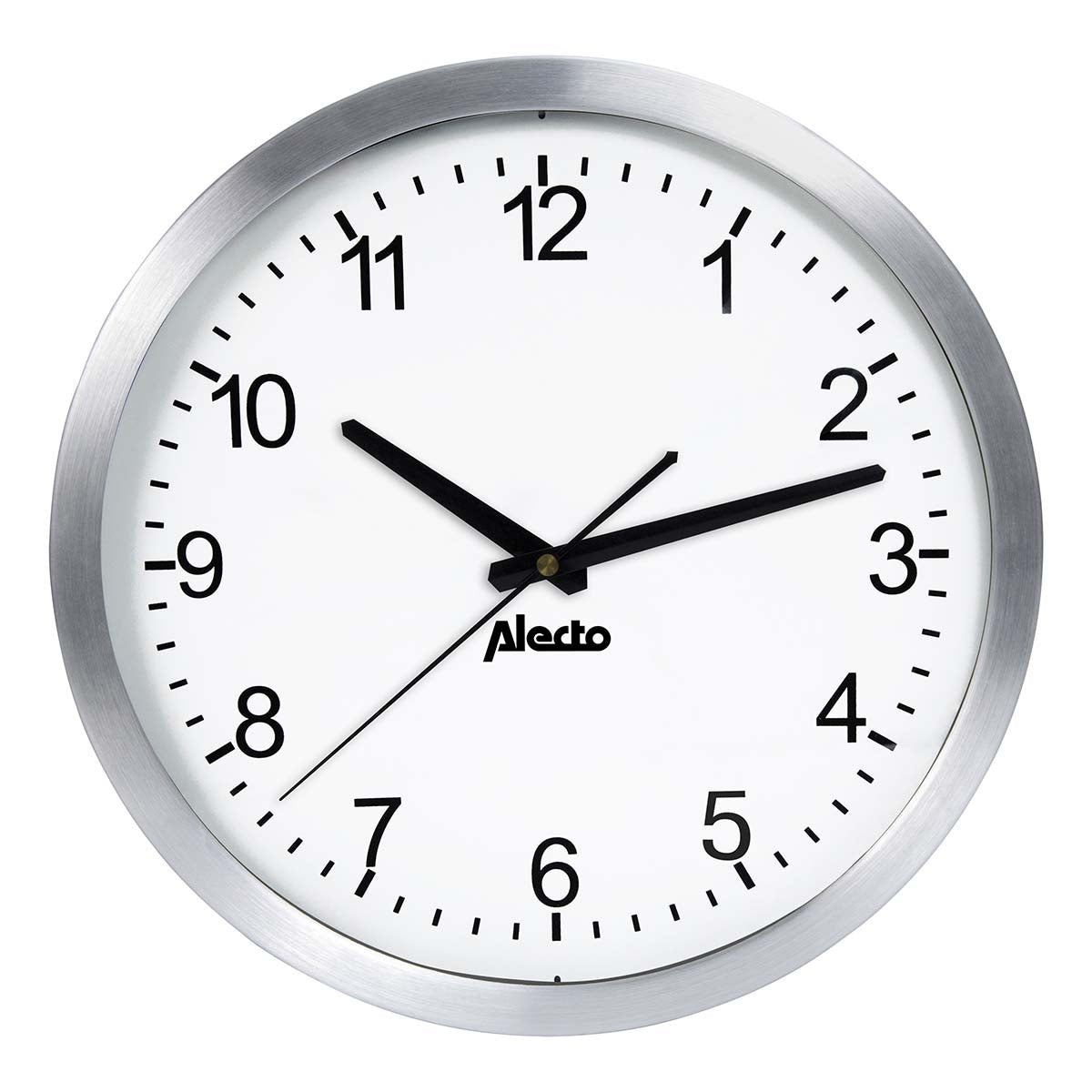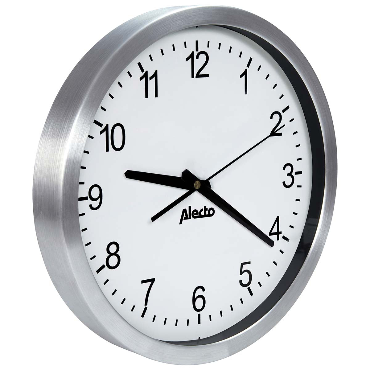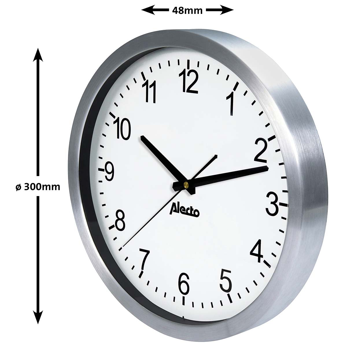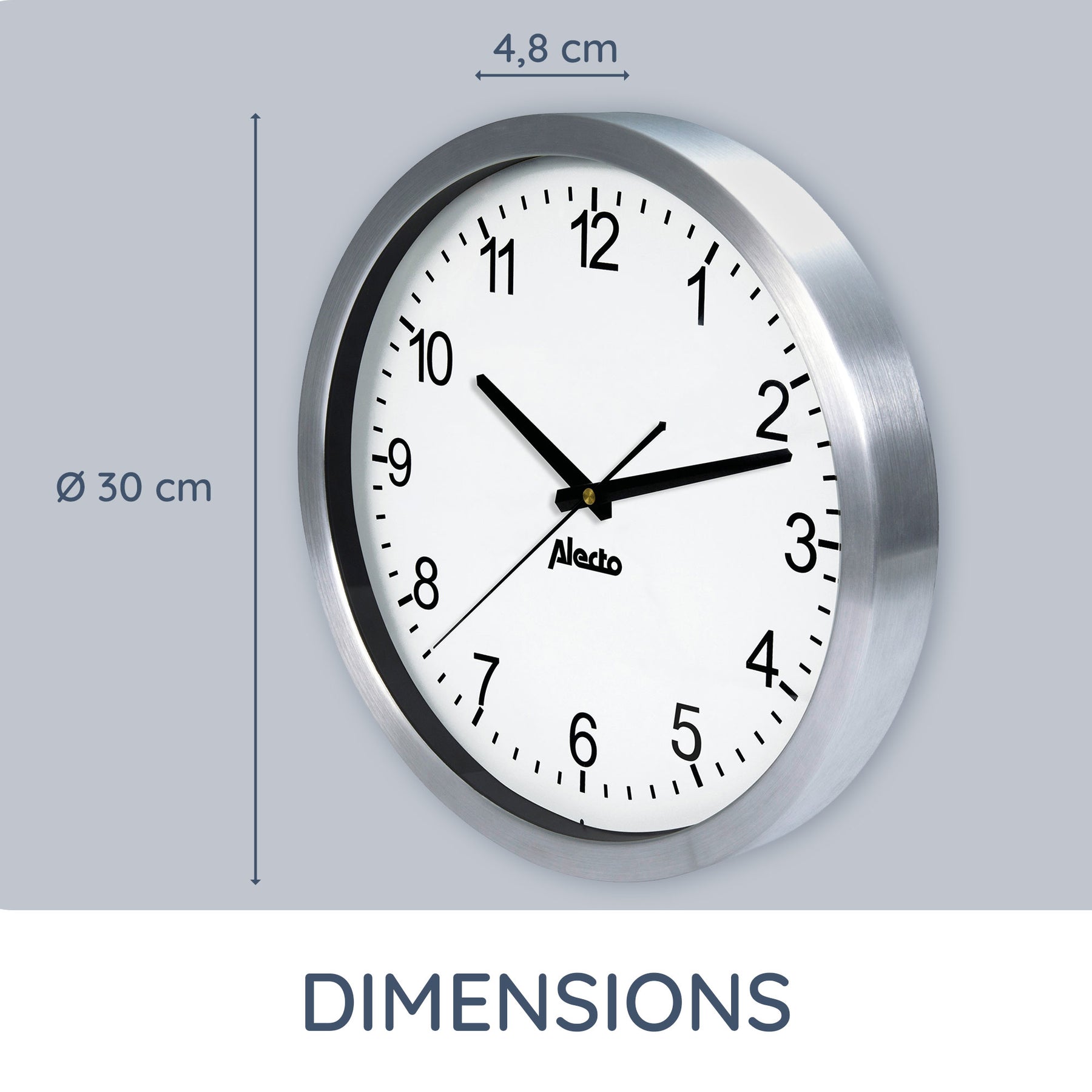 This aluminium analogue clock indicates the time. With a diameter of 30 centimetres you can use the clock in large rooms, due to the extra-large face the time can be read from a distance. The clock operates silently so there is no distraction with any ticking.