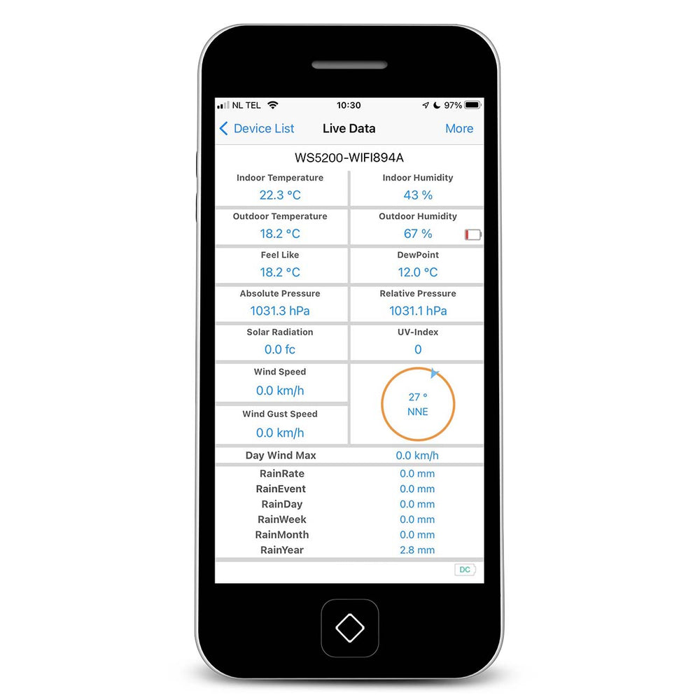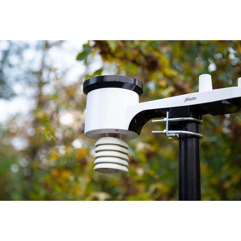 The Alecto WS5200 is a 6-in-1 Wi-Fi weather station with outdoor sensor and app control, ideal for the professional user. This digital weather station’s six sensors give you immediate and comprehensive insight into the current local weather conditions. Simply link the professional weather station to online weather services such as Weather Underground, Weather Cloud and more. You can add your favourite weather station to these large networks and get additional access to data from any other connected weather stations.